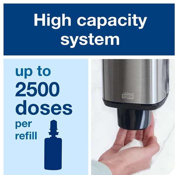 Опаковка: 6бр. по 1л. в кашон , 1литър = 2500 дози Консумация: 1 доза е достатъчна Подходящ консуматив: Tork S4 Premium Сапун на пяна 520501 Производител : Essity – Германия