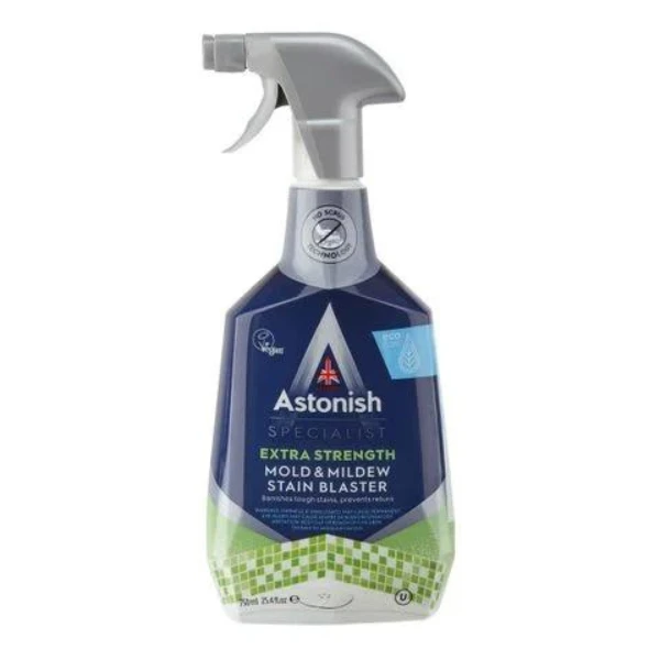 Astonish Mould and Mildew е спрей за мухъл, предназначен да осигури защита на повърхностите във влажни помещения. Препарата притежава биоцид с фунгицидно действие, което позволява премахването на мухъл и плесен от повърхностите.