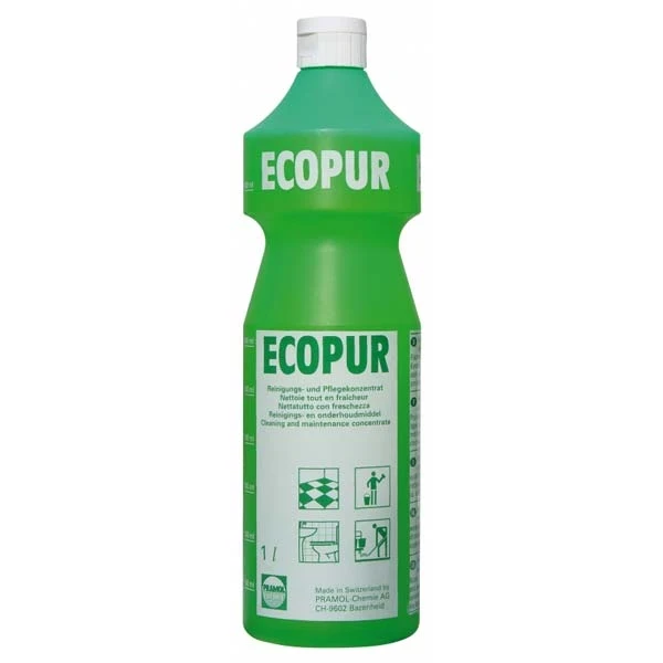 Ecopur е мощен, слабо пенлив концентрат за почистване и поддръжка с приятен свеж аромат. Почиства хигиенично, дезодорира и поддържа. Без киселина, нежен към материалите и кожата. За ръчно и машинно приложение. Редовното използване във влажни зони възпрепятства натрупването на котлен камък. Области на приложение: За всички повърхности и подове, които могат да се мият, като PVC, линолеум, мрамор, естествен и синтетичен камък. За плочки, фитинги, санитарен порцелан, хром и хромирана стомана. Дозиране: Добавете 20 – 40 мл. към 8 л вода (0,25 – 0,5%). Инструкции за употреба: Нанесете неразредено върху влажна гъба или кърпа за подхранващо почистване. Измийте големи повърхности и предмети с разтвор. Нанесете неразреден върху гъба, кърпа или ръчен пад за почистите упорито замърсяване. Използвайте скуиджи за големите повърхности. Разход: 10 л разтвор Ecopur за 40 – 100 м2 Специални съвети: Измийте стените отдолу нагоре, за да избегнете стичане на вода. Проверете цветоустойчивостта на боядисаните стени и повърхности на незабележимо място преди употреба. Производителят отказва всякаква отговорност за щети от неправилно използване на продукта. Техническа информация: Стабилност при съхранение: не по-малко от 2 години рН стойност (концентрат): 9,5 рН стойност (концентрат): 7 Състав: анионни и нейонни повърхностно активни вещества, водоразтворими разтворители, средства за защита на кожата, цвят, парфюм, консервант Опаковка: 1 л. Производител: Pramol - Швейцария