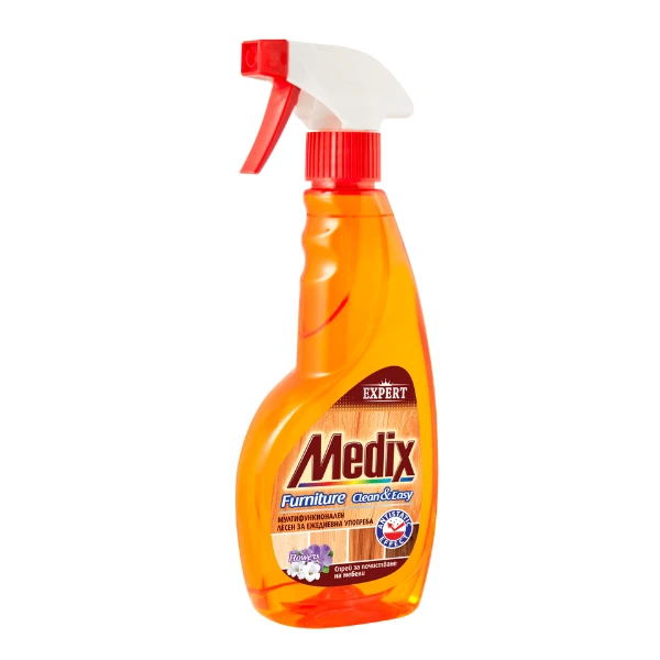 Medix Furniture Clean Easy e мултифункционален и удобен спрей за ежедневна употреба. С антистатичен ефект, който предпазва от бързото натрупване на прах. Ефикасно почиства без следи от замазване и не оставя лепкаво усещане. Осигурява експертна грижа, като прави мебелите блестящи от чистота и придава дълготраен свеж аромат на цветя.