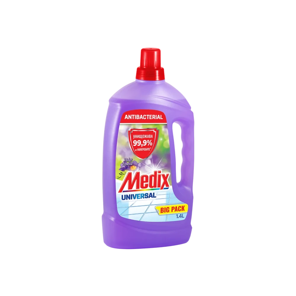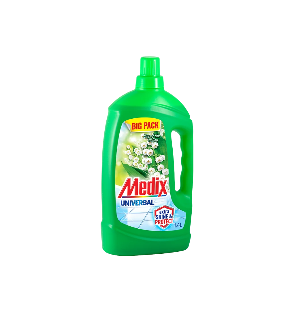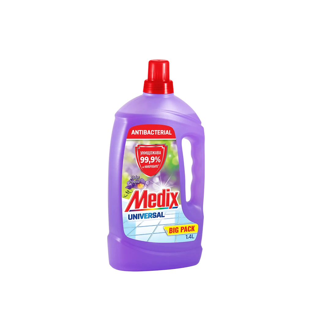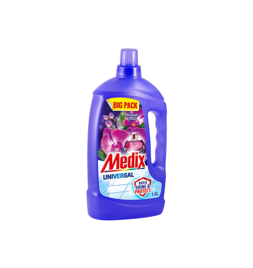 Medix Universal универсален почистващ препарат за бързо и лесно почистване на многообразие от повърхности, който пленява с елегантно парфюмно ухание. EXTRA SHINE & PROTECT формулата се грижи за повърхностите като образува защитен филм, улеснява последващото почистване, подпомага по-бързото изсъхване и придава допълнителен блясък.