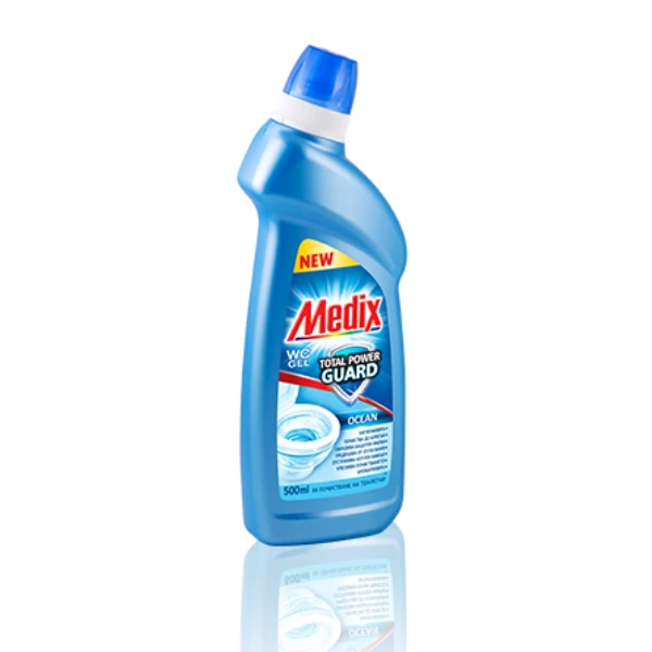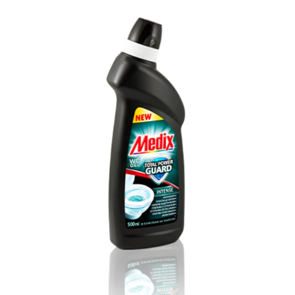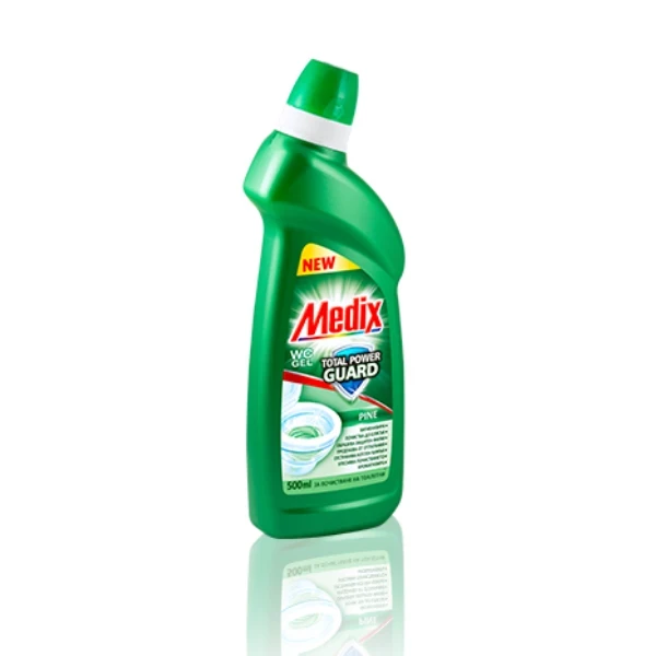 Мощният гел ефективно отстранява замърсявания и котлен камък. Формулата образува защитен филм върху повърхността на тоалетната чиния и по този начин предпазва, като намалява последващо задържане и отлагане на мръсотия и варовик. С Medix WC Gel Total Power Guard всяко следващо почистване е по-лесно, а тоалетната е хигиенично чиста и още по-блестяща. С дълготраен и отличителен аромат.
