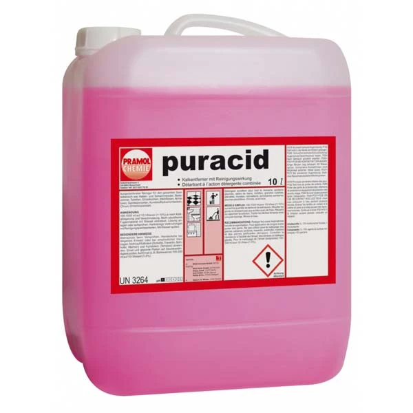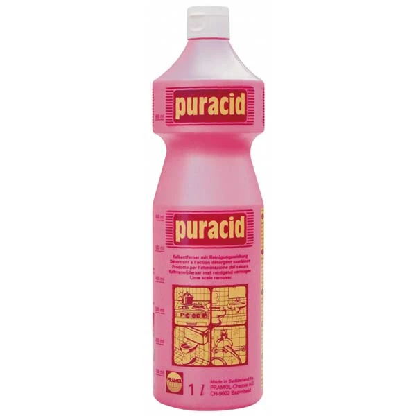 Puracid е течен почистващ препарат за ефективно отстраняване на упорити варовикови отлагания и остатъци от сапун. Добър почистващ ефект и върху мазнини и замърсявания. Не предизвиква корозивни изпарения. Детергентните суровини са биоразградими. Повърхностите и фитингите, почистени с Puracid , са хигиенично чисти.