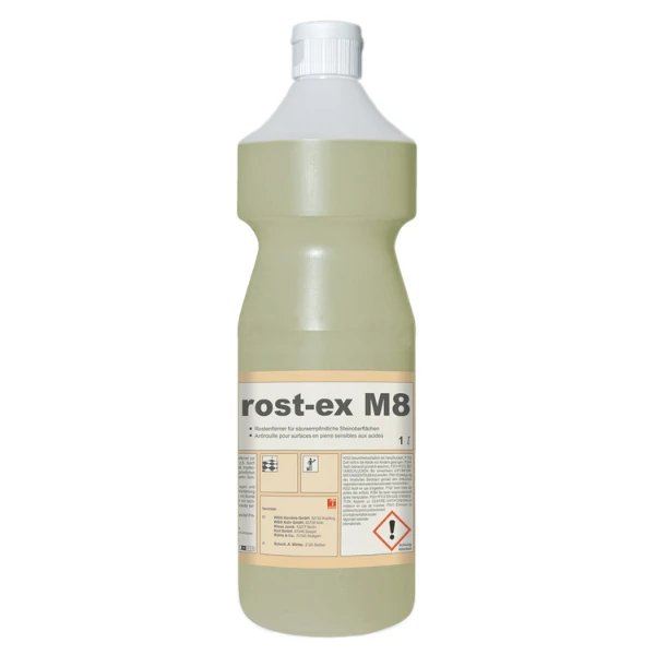 Rost-ex M8 Препарат за отстраняване на ръжда от каменни повърхности, чувствителни към киселина. Високоефективен, концентриран, неутрален продукт, който премахва ръждивите остатъци, оставени от мебели, метални инструменти, капещи кранове и т.н., върху чувствителни към киселина покрития като мрамор, шисти, травертин, варовик, солхофер, теракот, цимент и др. Области на приложение: За използване навсякъде на закрито и на открито, за премахване на петна от ръжда от всички чувствителни към киселини повърхности. Дозиране: Използвайте неразреден. Инструкции за употреба: Нанесете неразреден и разпределете равномерно. Когато агентът се оцвети в лилаво, това е знак, че работи. Повторете отново след около 5 – 15 минути, разтъркайте с четка или червен пад и изплакнете с много вода. Всяко лилаво оцветяване ще изчезне само. Повърхността трябва да бъде защитена от вода и директна слънчева светлина, докато продуктът се използва. Специални съвети: Ако не сте сигурни дали да използвате продукта или не, първо тествайте на незабележимо място. Производителят не поема отговорност за щети от неправилно използване на продукта. Техническа информация: Стабилност при съхранение: най-малко 2 години Съхранение: пазете от замръзване рН стойност (концентрат): 8 Състав: нейонни повърхностноактивни вещества, вода Произвoдител: Pramol – Швейцария