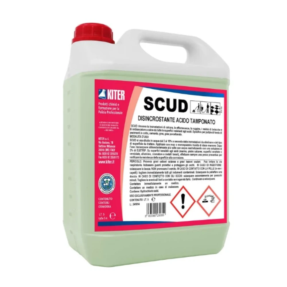 Scud е концентриран киселинен почистващ препарат за отстраняване на варовикови и солни отлагания, различни соли и остатъци от разпадането на солите, ръжда, боя и оцветители, ефлоресценция. Приложение: Почистващият препарат е приложим върху повърхности от гранит, котто, грес, гранитогрес, клинкер и др. естествени каменни, твърди киселинно-устойчиви повърхности. Дозировка: Scud се разрежда с вода от 2% до 10% (от 200 мл. до 1 л. на 10 л. вода) според степента на замърсяване, както и вида на повърхността. Нанася се с помощта на моп, абразивна гъба или с подопочистваща машина. След третиране препоръчително е изплакване обилно с вода. Характеристика: Състав: Киселини, разтворители водоразтворими, нейонни и йонни ПАВ, ароматизатори, антикорозиви Характеристика: Флуид Аромат: Бадем Активност: pH:0,5 Вид почистване: Основно Пенливост: Ниска Биоразградимост: 0,5 (≤ 90% за 24 ч.) Водоразтворимост: 100% Опаковка: 5л Производител: Kiter – Италия