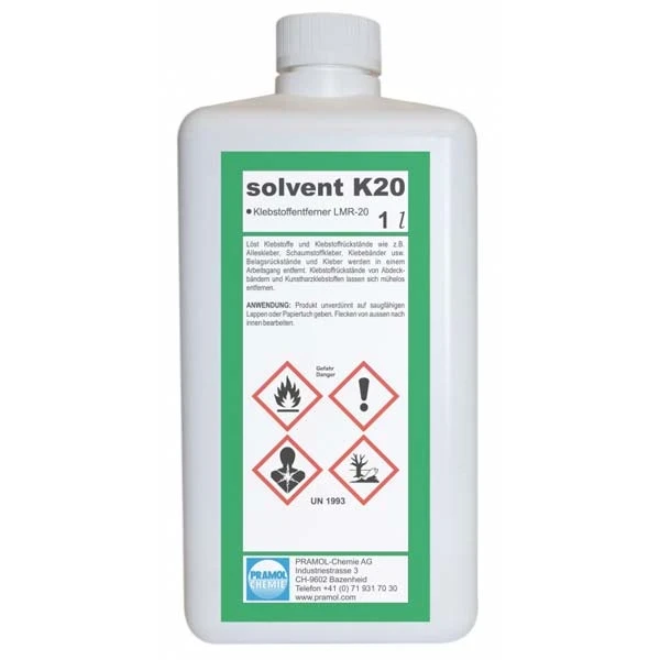Solvent K20 е високо ефективен разтворител за отстраняване на лепила, етикети, уплътнители, самозалепващи ленти, стикери, катран, смола, мазнини и почти всички гумени остатъци от нефтопродукти. Области на приложение: За устойчиви на разтворители повърхности от всякакъв вид, като например метални, естествени и изкуствени камъни, минерални повърхности, керамика и др. Дозиране: Не се разрежда. Инструкции за употреба: Нанесете неразреден продукт върху абсорбираща или хартиена кърпа, приложете и оставете да реагира за 5-10 минути. (покрийте и повторете, ако е необходимо). Предварително тествайте съвместимостта на материалите на незабележимо място. Специални съвети: Възпламеним. Използвайте само при добра вентилация. Съхранявайте далеч от открит огън и нажежени предмети. Производителят не поема отговорност за щети от неправилно използване на продукта. Техническа информация: Стабилност при съхранение: най-малко 2 години Съхранение: не излагайте на пряка слънчева светлина / да не се съхранява над 30 ° C Състав: органични разтворители Опаковка: 1 л. Производител: Pramol – Швейцария