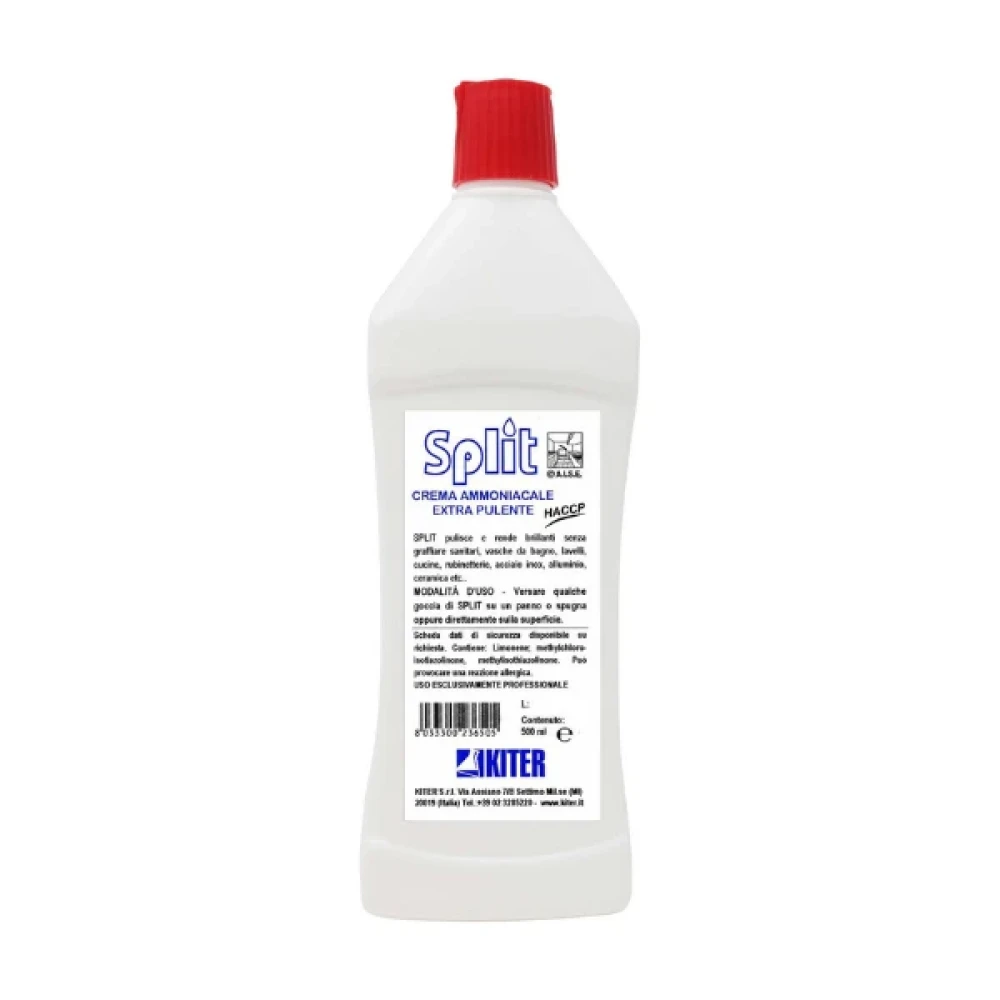 Split e почистващ крем с амоняк. Той почиства старателно с леко абразивно действие без да надрасква мивки, керамика, порцелан, неръждаема стомана, пластмаса, мрамор и емайлирани повърхности, като обезмаслява, почиства и полира без да надрасква повърхностите.