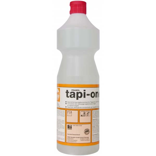 Tapi-one e специален, слабо пенлив почистващ препарат за килими и текстилна тапицерия. Премахва много видове замърсяване. Подходящ за спрей екстракция и текстилен пад. Изключително подходящ за метода за отстраняване на петна, когато се използва неразреден. Области на приложение: За всички устойчиви на пране килими и тапицерии от вълна и синтетични влакна. Дозиране: Отстраняване на петна: Нанесете неразредено. Спрей- екстракция: 10 – 20% (Добавете 1 – 2 л към 10 л вода). Bonnet за тапицерия: 5 – 20% (Добавете 0,5 – 2 л към 10 л вода). Инструкции за употреба: Щателно вакуумирайте килима или тапицерията. Премахнете петната. Пулверизирайте разтвор, оставете да действа за кратко, след това почистете със спрей- екстрактор с вода. Топлата вода повишава ефективността на почистване. Разход: 1 л концентрат за 40 – 60 м² в зависимост от типа килим / тапицерия и замърсяване. Специални съвети: Проверете цветоустойчивостта на килима и тапицерията на незабележимо място преди употреба. Не превишавайте температурата на водата от 40 ° C върху вълна. Производителят отказва всякаква отговорност за щети от неправилно използване на продукта. Техническа информация: Стабилност при съхранение: не по-малко от 2 години рН стойност (концентрат): 8.5 Състав: почистващи агенти, буферни вещества, консерванти, вода Опаковка: 1 л. Производител: Pramol – Швейцария