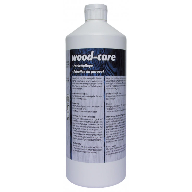 Wood-care e идеален за цялостна поддръжка и грижа за дървени подови настилки. Почиства, предпазва, подхранва и полира пода едновременно. Осигурява защитно покритие с копринен блясък. Може да се използва в неразредена форма за цялостната поддръжка на подови настилки. Области на приложение : За запечатани и незапечатани паркетни, дървени и коркови подове. Дозиране : Грижа и почистване: разредете 100 - 300 ml с 10 литра вода (1 – 3% разтвор) Обща поддръжка: Нанесете в неразредена форма Инструкции за употреба : Нанесете разтвора умерено върху повърхността на пода с помощта на моп или друг апликатор.Преди употреба за цялостната поддръжка на пода, уверете се, че повърхността е чиста и суха. Почистете повърхността, ако е необходимо. Нанесете по един слой върху запечатани подове и по два слоя върху незапечатни подове. Оставете да изсъхне за 60 минути, преди да нанесете втори слой. Не нанасяйте покрития от други продукти. Важна информация: Производителят не поема отговорност за щети от неправилно използване на продукта. Техническа информация: Срок на годност: най-малко 2 години Състав: Повърхностно активни вещества, восъци за грижа за пода, консерванти, аромат, вода Опаковка: 1 л. Производител: Pramol – Швейцария